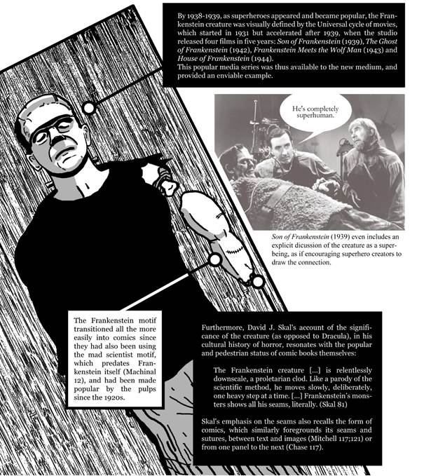 This context explains why so many early superheroes—The Moth, Bozo the Robot, Chic Carter, but also Batman & Robin and the Submariner—encountered avatars or copycats of Dr. Frankenstein and his creature between 1940 and 1945. The Promethean scientist is after all one of the canonical ways to create a superhero, as illustrated by the origin story of the Human Torch (“Even I fear the monstrosity which I have created,” says his creator on the first page of that story, in true Frankensteinian fashion [Marvel Comics #1, October 1939]) or Captain America in 1941 (“It is working! There’s power surging through those growing muscles” [Captain America Comics #1, December 1940]). Michael Chabon, in his novel TheExtraordinary Adventures of Kavalier and Klay, has also convincingly argued that the early superheroes were connected to the myth of the Jewish golem. While this resemblance remains elusive—despite the best efforts of a few scholars to consolidate the hypothesis (Kaplan; Weinstein)—it suggests that superhero narratives share salient thematic concerns with the Frankenstein mythos.